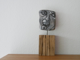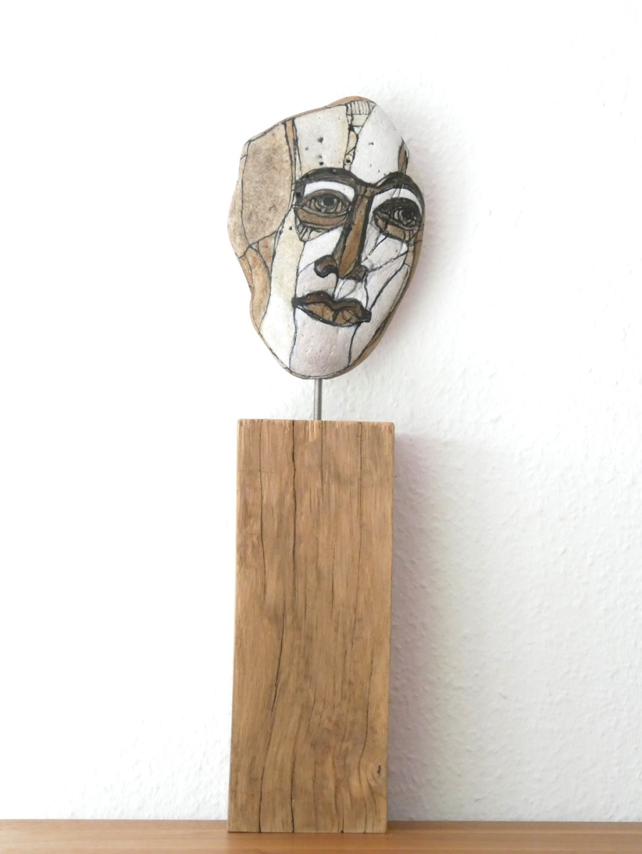 "Denker" - Acrylfarbe auf Stein 18 x 15 cm - Höhe mit Balken 45 cm 2025